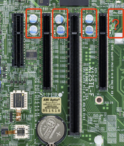 Upon conducting a more detailed examination of the board, I observed a disparity between PCIe Slot7 and PCIe Slots 4-6 in terms of the presence of capacitors. Specifically, I noticed that PCIe Slot7 lacked the capacitors found in the other slots. While I wasn't certain if this was directly related to the issue at hand, it prompted me to reevaluate the card placement in the build.