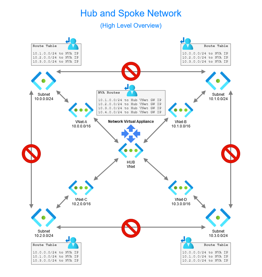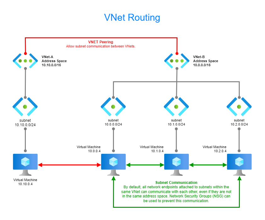 The diagram presented here utilizes generic VNet names such as VNet-A, VNet-B, etc. It is intended to serve as a study guide for comprehending the connection between Azure Subnet communication and the communication between Azure Subnets and VNets via VNet Peering. In the production network of my Azure lab, Azure VNet Peering and Azure Route Tables are employed to facilitate communication with the Sophos XG Next-Gen Firewall, which resides within a separate VNet.