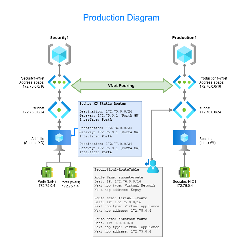 The provided production diagram includes the names of all the resources and services currently being utilized in my Azure lab. Please observe the presence of two VNets and the VNet Peering established between them. Additionally, it is important to note the significance of the Sophos XG Static Routes and the production1-routeable for ensuring proper data flow. These routing mechanisms play a crucial role in maintaining the correct flow of data within the network.