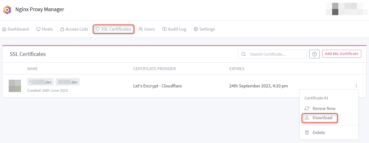 - Next to the certificate, click on the hamburger/elipses icon and select Download.
