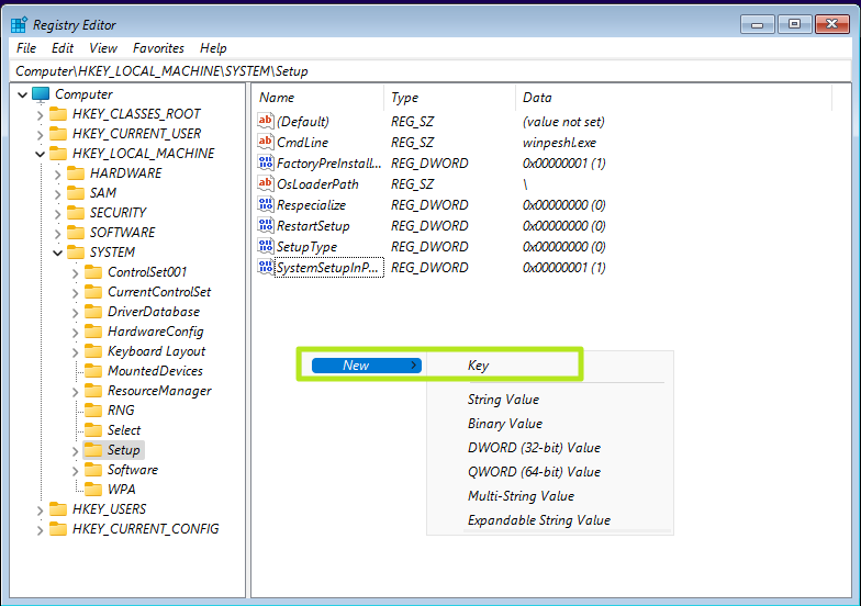 - Navigate to HKEY_LOCAL_MACHINE\SYSTEM\Setup: