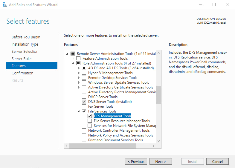 Alternatively, DFS Management Tools can be installed from the Add Roles and Features Wizard: