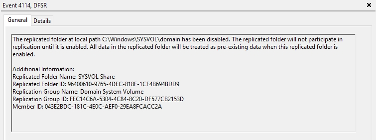 dfsrdiag PollAD - Using PowerShell, search for the event 4114 to confirm SYSVOL replication is disabled:
