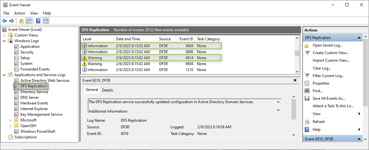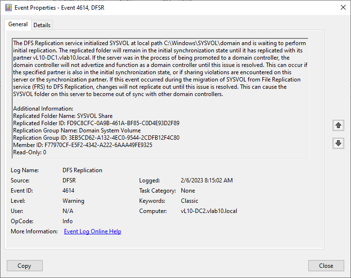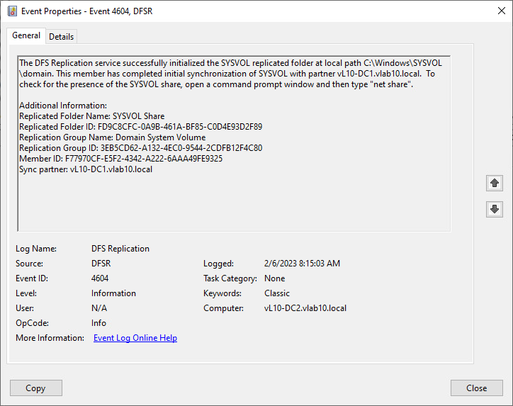 - Using PowerShell, search for events 4614 and 4604 to confirm successful non-authoritative synchronization: