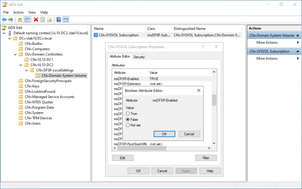 DC=<domain>,DC=local⮞OU=Domain Controllers⮞CN=<DC NAME>⮞CN=DFSR-LocalSettings⮞Domain System Volume⮞SYSVOL Subscription. - Change the Attribute Value for