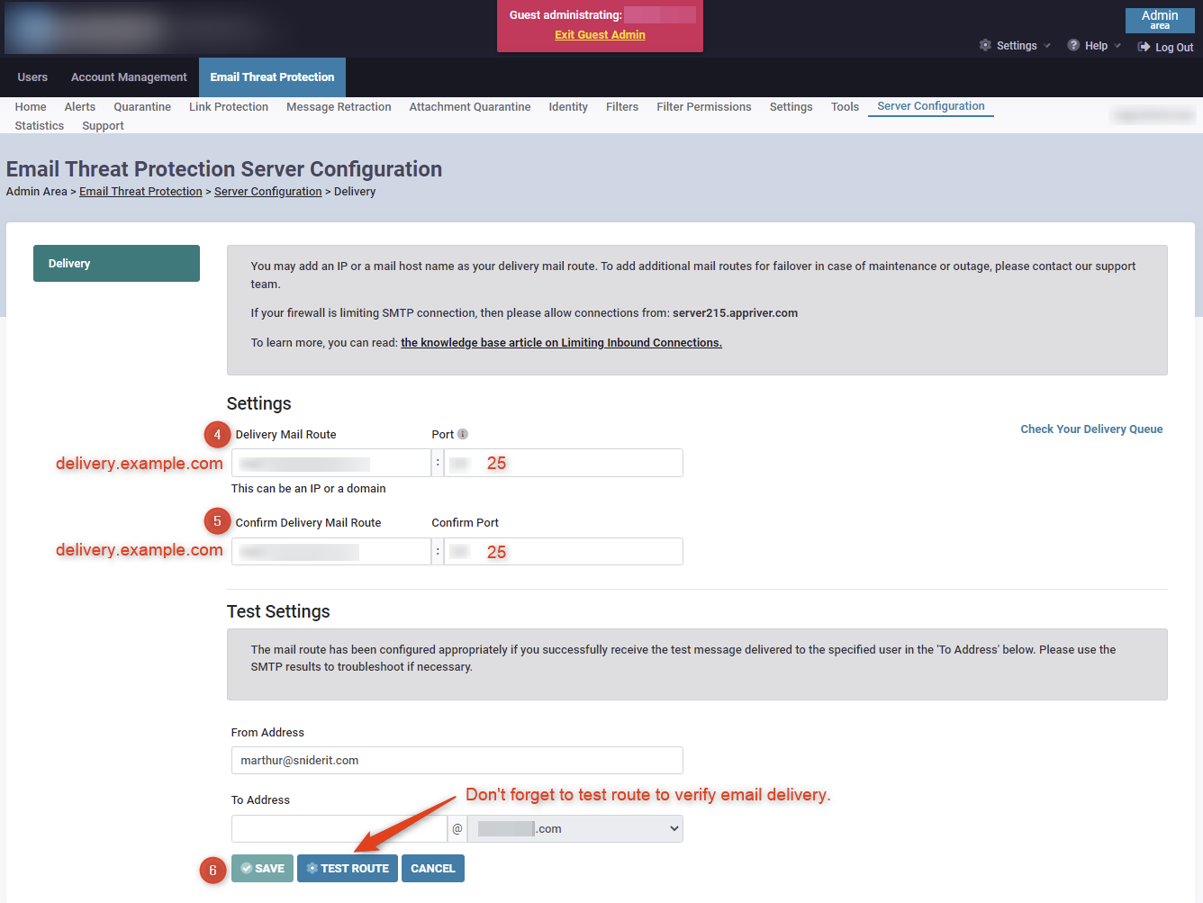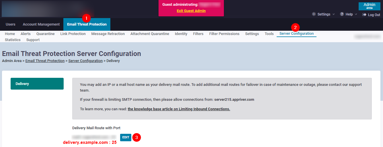 Once the CNAME has been created it will need to be added to the following section under the customers Guest Admin area. The existing entry can be edited to add the new email delivery address. In addition, the new delivery address can be tested as well within the edit page.
