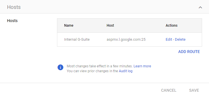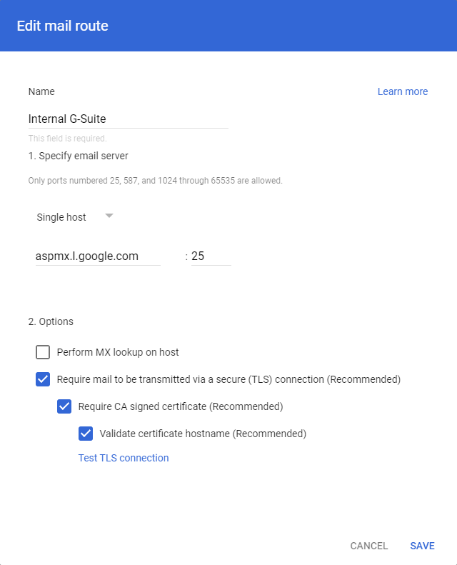 Internal G-Suite, for Single host, enteraspmx.l.google.comand port25(SMTP). -
